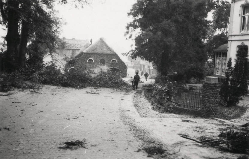 De dienstplichtigen gebruikten materialen van de boerderij links op de foto om een schuilplek te maken. De grote deuren dienden bijvoorbeeld als dak. Rechts voorin de foto staat het huidige restaurant Villa Grebbeoord.