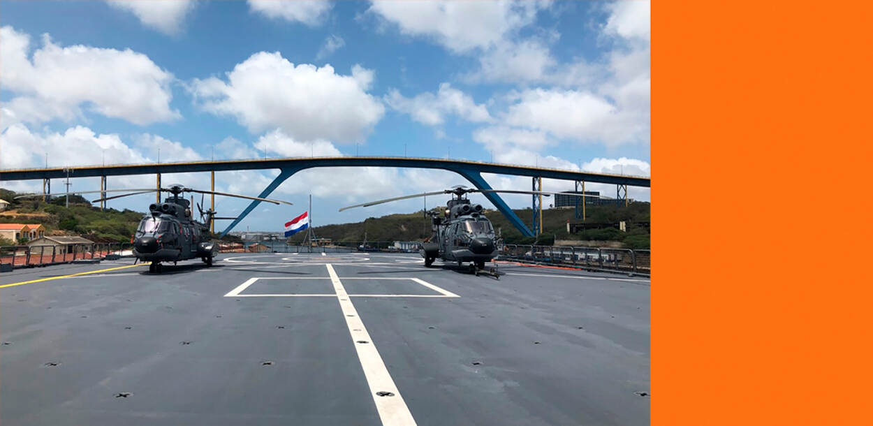 Een bijzondere samenstelling op het helikopterdek van Zr.Ms. Karel Doorman: het schip vaart met aan boord een NH90-helikopter én twee Cougars. Voor zowel de Koninklijke Marine als Luchtmacht is het een primeur om deze twee verschillende typen mee te hebben.