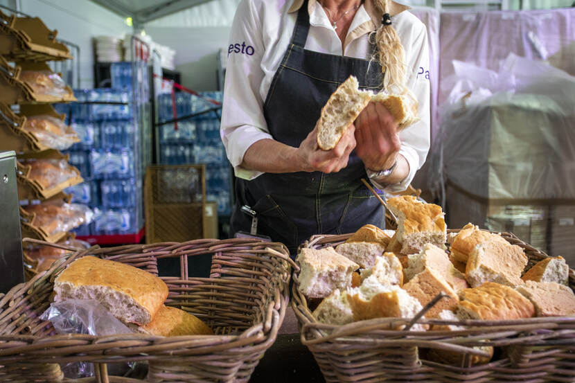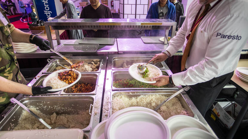 Op dagelijkse basis werken op Camp New Amsterdam zo’n 18 cateringmedewerkers. Met de komst van de evacués zijn er twee keer zoveel handjes nodig. In de keuken bij de bereiding, aan de voorkant bij het uitserveren. Doordat het Walaardt Sacré Kamp niet over een eigen keuken beschikt, moeten er dagelijks maaltijden heen en weer gereden worden vanuit het bedrijfsrestaurant in Camp New Amsterdam.