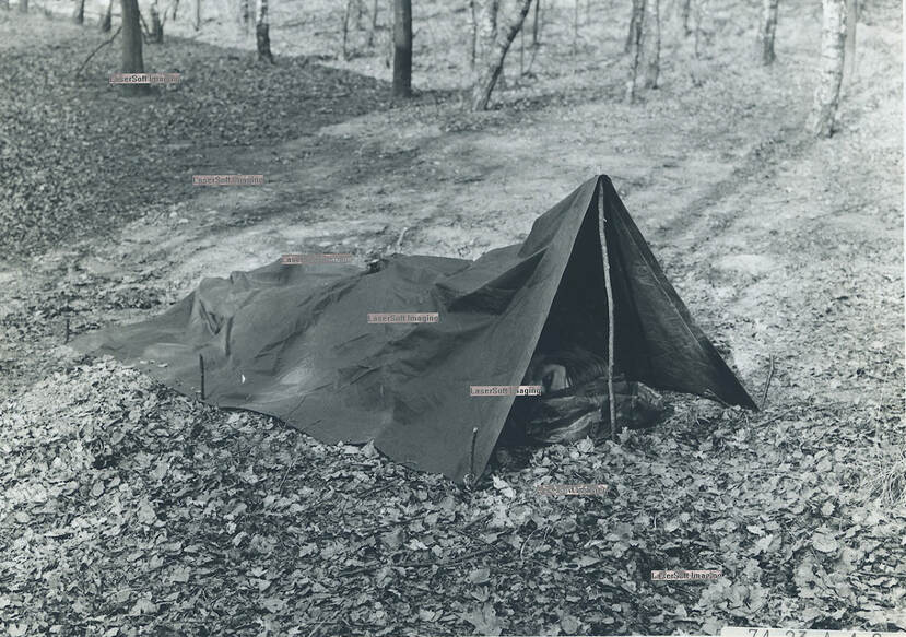 Slaapzak D werd geleverd met een zeil dat niet alleen als eenmanstent maar ook als cape te gebruiken was. Met 6 drukknopen aan het voeteneinde, kon de cape als 'tent' over de slaapzak worden getrokken. Stokken voor het tentje moesten uit de natuur worden gehaald. Een onderzeil was niet nodig, want de onderkant van de slaapzak was waterafstotend. Ook mooi: aan het hoofdeinde van de slaapzak zat een capuchon.