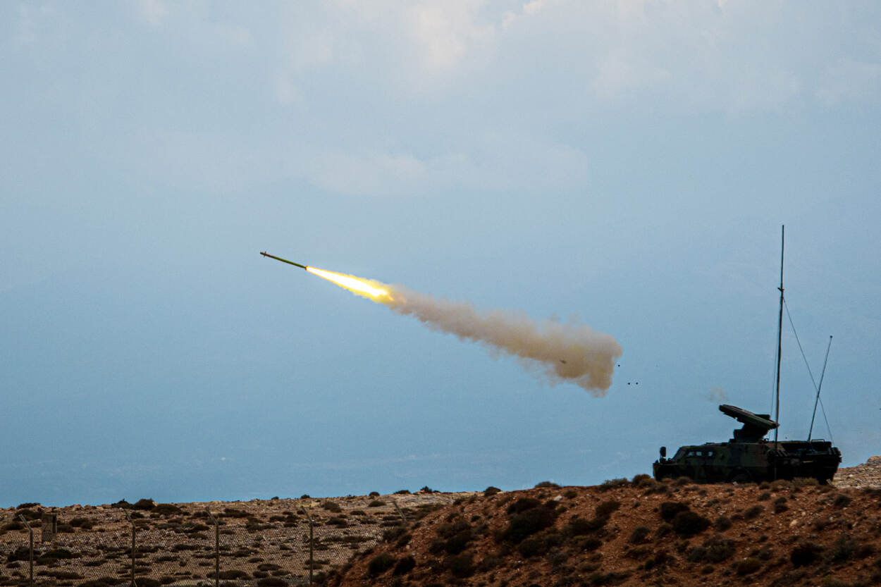 Nog een foto van het NAVO-schietterrein NAMFI op Kreta. Dit keer ijlt een Stinger-luchtdoelraket naar zijn doel. Een spectaculair gezicht dat een beetje doet denken aan vuurpijlen op oudejaarsavond. Een vijandelijke vlieger zal daar waarschijnlijk heel anders over denken, want de Stinger is een gevreesd wapen. Het DGLC zorgde voor de foto.