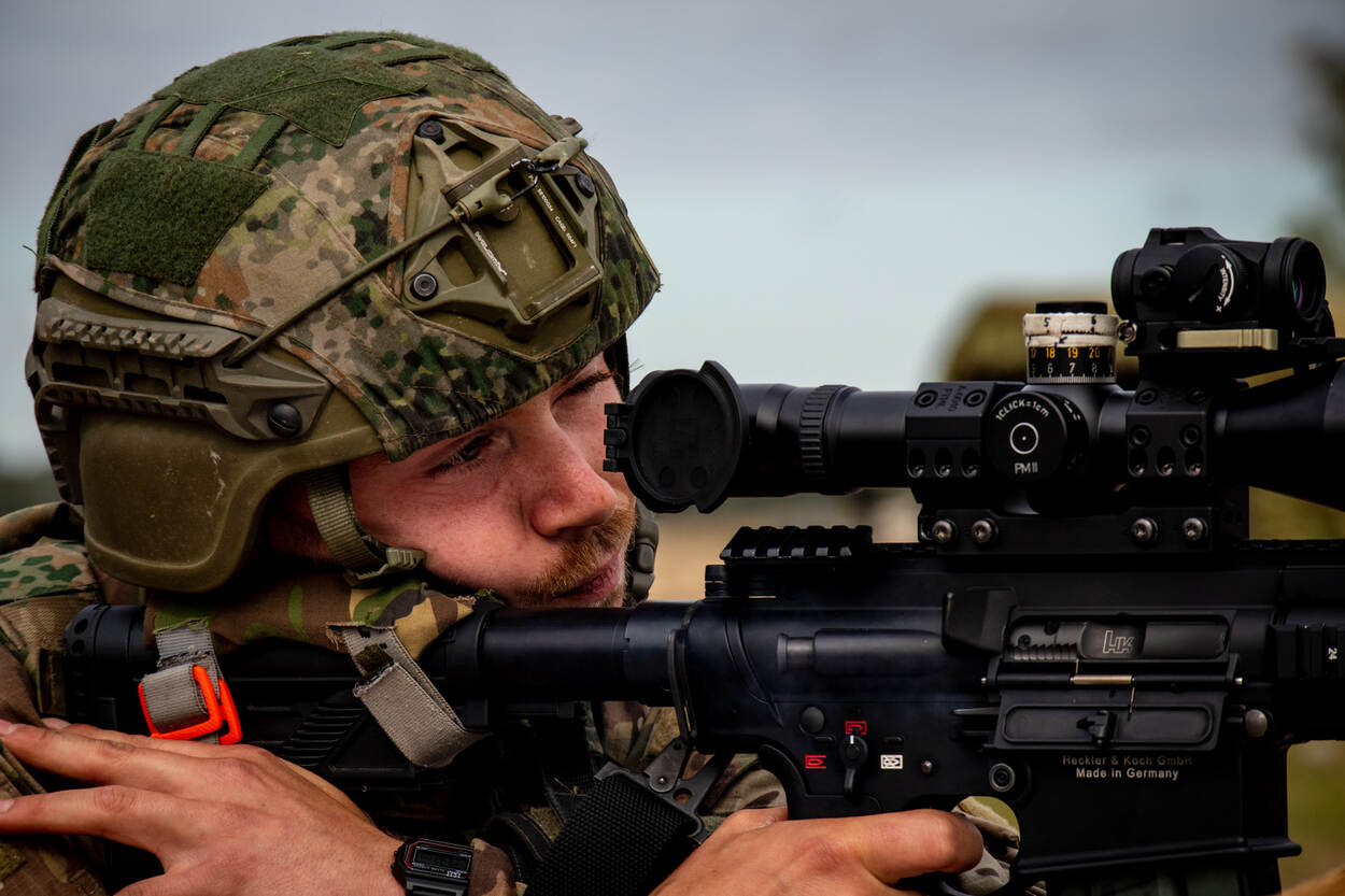 In Litouwen nemen ze schietvaardigheid uiterst serieus. 'Marksmen' van 43 Gemechaniseerde Brigade die deel uitmaken van de Battlegroup Lithuania van de NATO enhanced Forward Presence trainen er op afstanden tot 600 meter. Een 'marksman' is een schutter die deel uitmaakt van een infanteriegroep en zelfstandig doelen aangrijpt. Het wapen op de foto is een Heckler en Koch 417. De foto is van tweede luitenant Folko Sikkema.