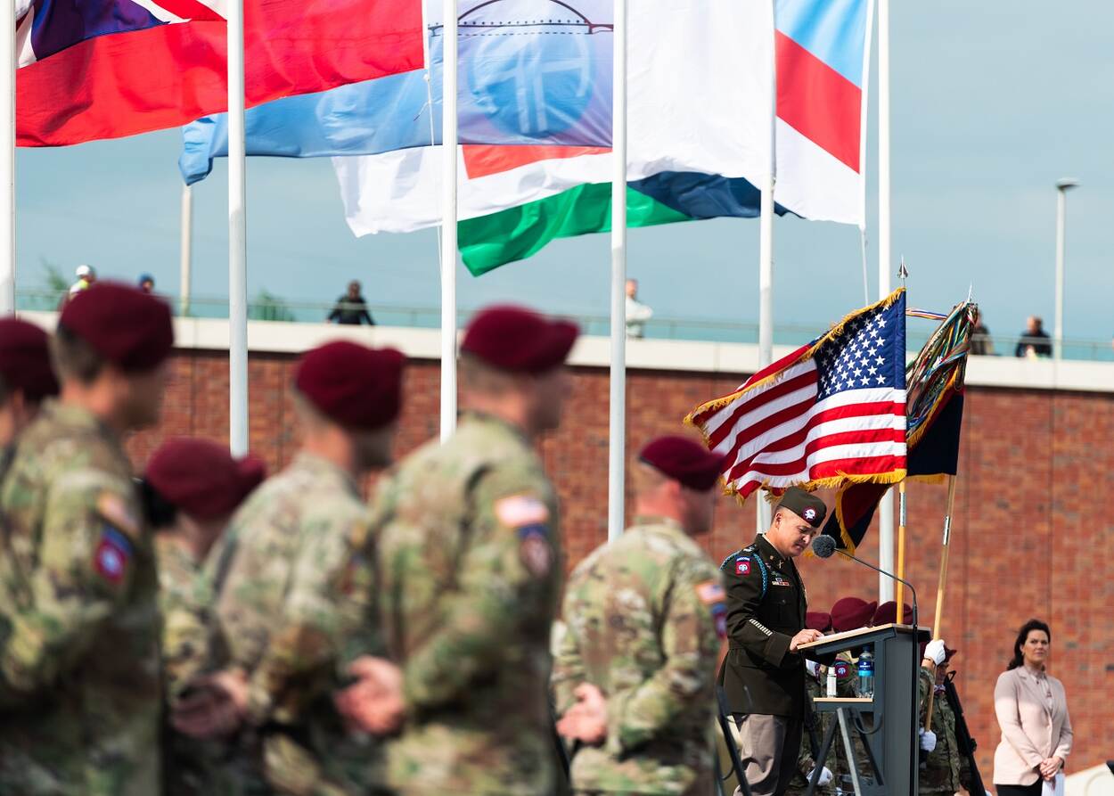 Sergeant Stephen P. Perez legde onlangs kolonel Phillip J. Kiniery III vast tijdens zijn speech bij de Waal voor de 77ste herdenking van operatie Market Garden. De commandant van de 2nd Brigade, 82nd Airborne Division memoreerde de massale luchtlandingen, waaraan Amerikaanse, Britse en Poolse militairen deelnamen.