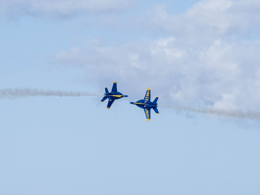 Twee F-18E Super Hornets van het demonstratieteam Blue Angels vliegen met hoge snelheid op elkaar af. Het team van de Amerikaanse marine bestaat dit jaar driekwart eeuw en dat willen ze weten ook. De foto werd in San Francisco gemaakt door MCS2 Hector Carrera. In 2006 waren de 'Blues' ook in Nederland te zien bij de Luchtmachtdagen in Leeuwarden.