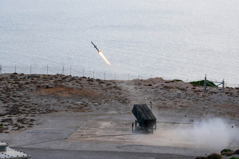 Een luchtaanval! Maar gelukkig is het Defensie Grondgebonden Luchtverdedigingscommando paraat en binnen seconden snelt een AMRAAM-raket op zijn doel af. Tijdens een schietoefening op het Griekse eiland Kreta schoot het DGLC zowel met de Patriot, AMRAAM als Stinger. Foto: DGLC.