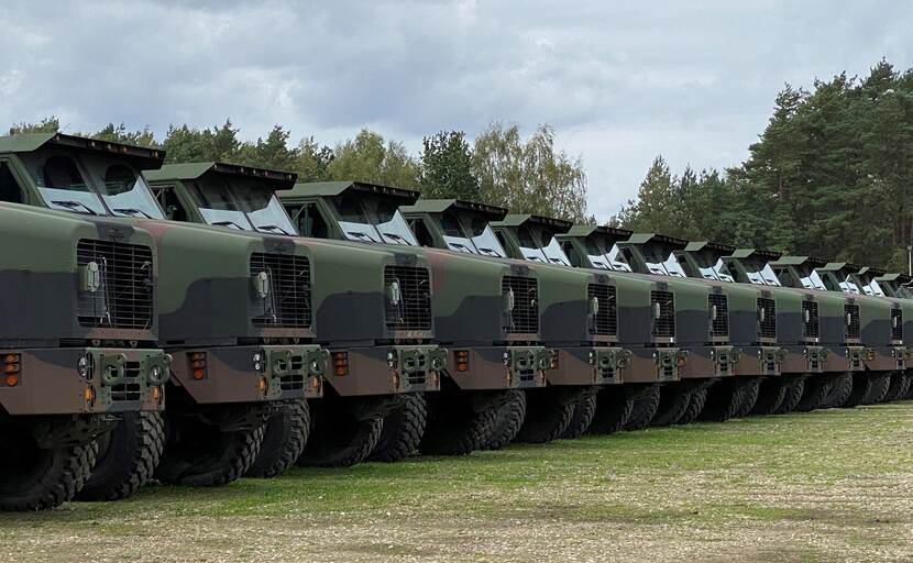 Camaron Porter legde onlangs in het Belgische Zutendaal deze lange rij Amerikaanse vrachtwagens vast. Dit materieel wordt in de hier gevestigde Army Prepositioned Stock-2 worksite gereed gehouden voor inzet. Op dit moment staan er 6.700 voertuigen in Zutendaal, waarmee een kleine brigade op de wielen kan worden gezet.