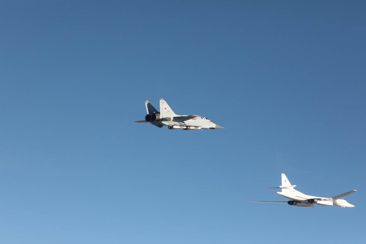 Een Tu-160 bommenwerper met zijn escorte, een MiG-31 Foxhound. De MiG is zwaarbewapend met raketten tegen vliegtuigen.