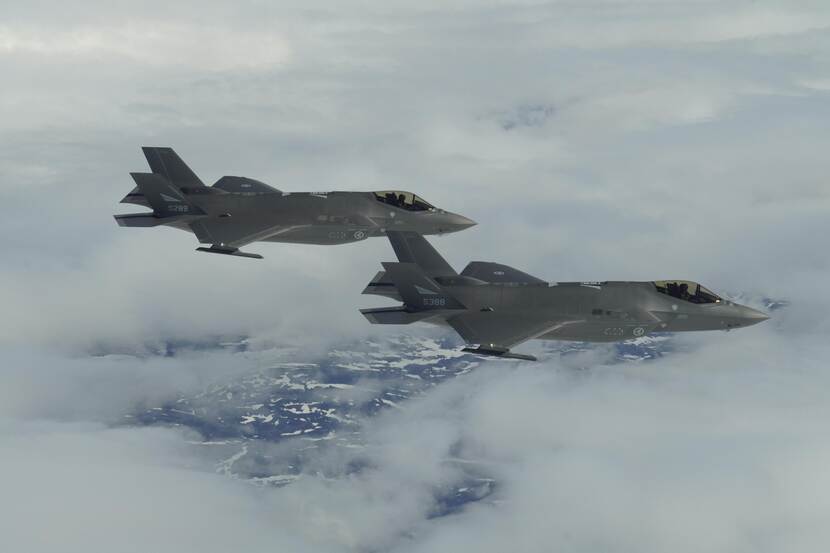 Twee F-35's op patrouille boven het grillige Noorse landschap.