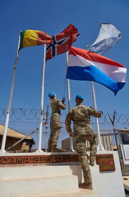 De Nederlandse vlag wappert naast die van Noorwegen, Mali en de VN. Noorwegen beheert kamp Bifrost, waar de Nederlanders verblijven.