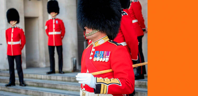 Er zit een geschiedenis van ruim tweehonderd jaar aan de mutsen vast. In 1815 versloeg het 1st Regiment of Foot Guards de Franse Grenadier Guards van Napoleon bij Waterloo. Om hun overwinning te vieren, pikten de Britten de imposante bontmutsen van de vijand in. Tegenwoordig zijn er nog vijf regimenten die een speciale gekleurde pluim op de hoed hebben.
