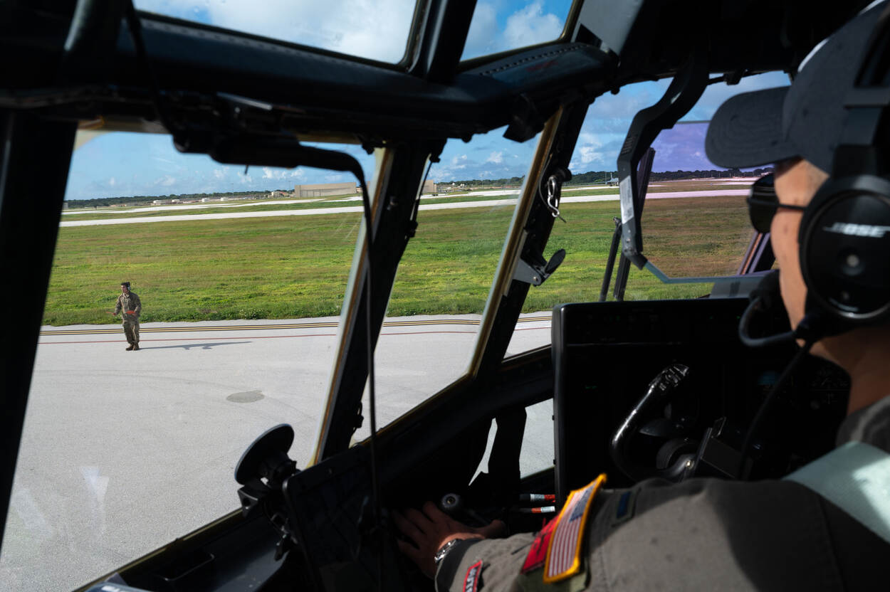 Eerste-luitenant Brian Tang in zijn C-130 Hercules, klaar voor een vlucht naar Oceanië. De Herculessen van de Amerikaanse luchtmacht zijn normaliter in Japan gestationeerd, maar opereren tijdens de Christmas Drop vanaf Guam. Foto: Staff Sergeant Gracie I. Lee.