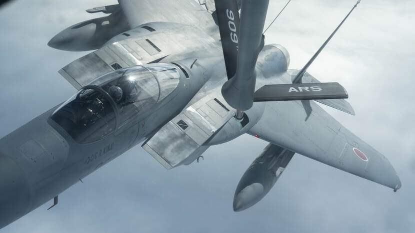 Airman 1st Class Moses Taylor was erbij toen een F-15J van de Japanse Air Self Defense Force boven de Grote Oceaan werd bijgetankt door een Amerikaanse KC-135 stratotanker van 909th Air Refueling Squadron. De toestellen deden eerder deze maand mee aan de oefening Southern Beach.