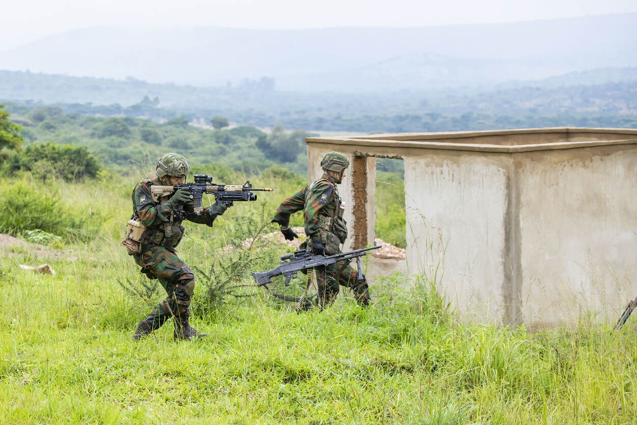 Voor de mannen en vrouwen van de Bravo-compagnie en het Antitankpeloton van de Delta-compagnie is het wennen. Normaal gesproken is het duidelijk waar de sectorbegrenzing is, staan schietpunten helder aangegeven en hoor je met een beetje geluk om de zoveel tijd de vertrouwde CADI-wagen. In het Oost-Afrikaanse Rwanda ligt dat toch even anders. Het begrip ‘houtje-touwtje’ is hier nog de dagelijkse realiteit. En dan kan er zomaar uit het niets op een groot grasveld een schietbaan ontstaan waarop de eenheid los gaat.