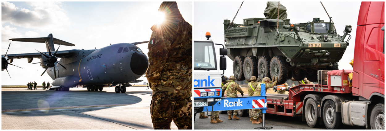 Links: aankomst van een Duits transportvliegtuig met materiaal voor de Eurofighters op een vliegbasis in Roemenië. Rechts: in Duitsland wordt een Amerikaans Stryker-gevechtsvoertuig op een vrachtwagen geladen voor transport naar Roemenië.