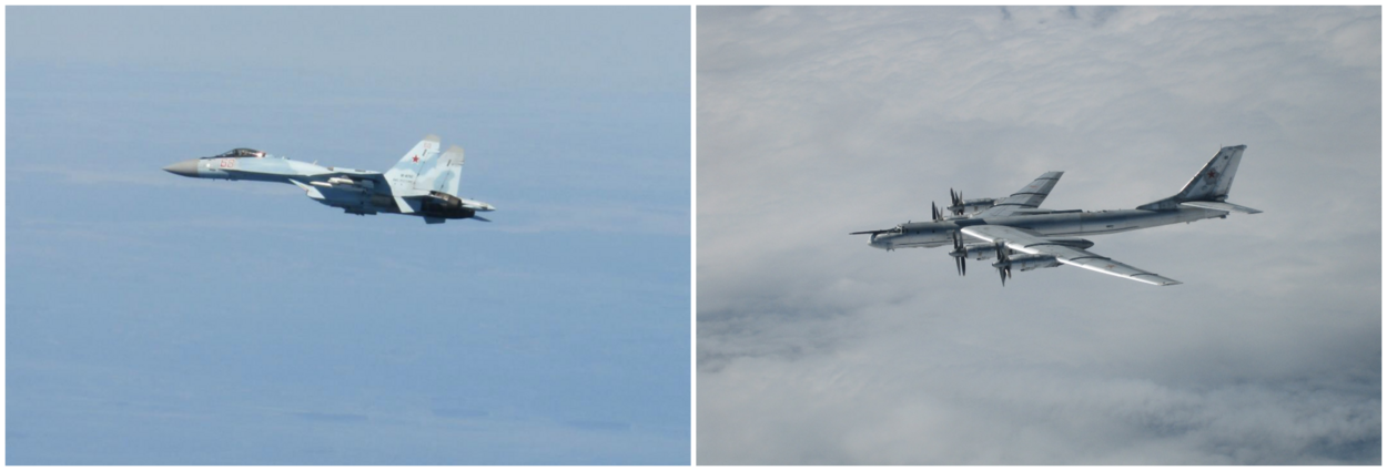 Links een Su-27 Flanker van de Russische luchtmacht, deze week gefotografeerd door een Amerikaanse F-15 vlieger boven de Oostzee. Rechts: een Russische Tu-95 bommenwerper, door Britse Eurofighters vorige week onderschept boven de Atlantische Oceaan.