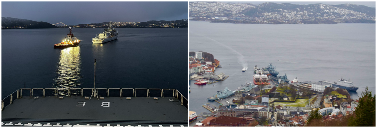 Links: sfeeropname van Zr.Ms. Van Amstel in de haven van Bergen in Noorwegen, genomen vanaf het bevoorradingsschip Berlin. Rechts: de schepen van SNMG1 in de haven van Bergen. Rechts Zr.Ms. Rotterdam, links Zr.Ms. Van Amstel.