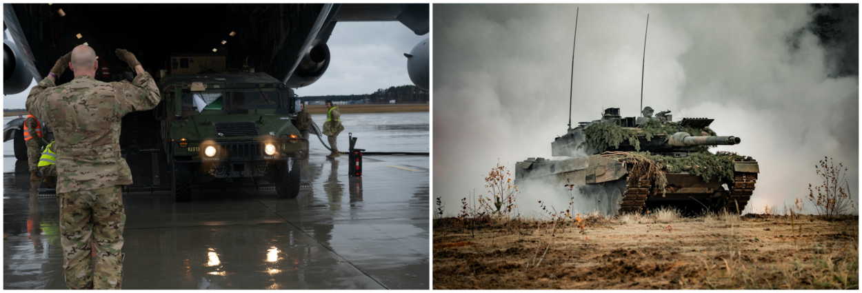 Links: Aankomst van Amerikaans materiaal op een vliegveld in Polen. Rechts: een Leopard-tank van het Duits-Nederlandse tankbataljon in actie.