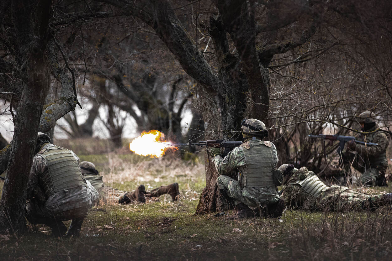 Een land valt een ander soeverein land binnen en dus is het zaak dat het bondgenootschap zijn verdediging op orde heeft. Het is na de Russische inval in Oekraïne een even fictief als realistisch scenario. Dat maakt de oefening wel heel actueel. De scheidslijn is bijna voelbaar. Rode Baretten stappen de helikopter uit en het oefenscenario in, terwijl boven hen witte lijnen aan de blauwe hemel prijken. Het zijn de sporen van gevechtsvliegtuigen die in hun Air Policing-taak de Roemeense grens bewaken.