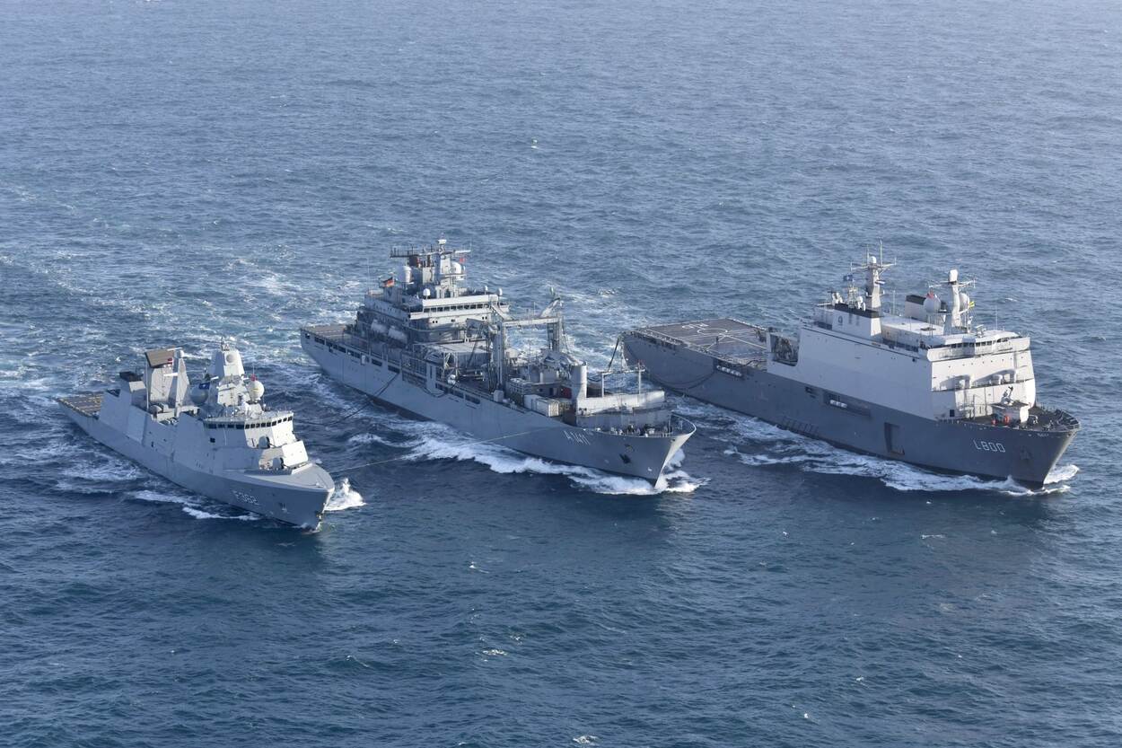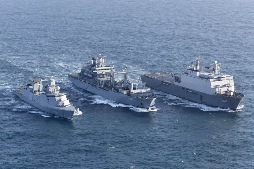 SNMG1 in actie: bevoorrader FGS Berlin voorziet het Deense fregat HDMS Peter Willemoes en Zr.Ms. Rotterdam van brandstof. (Foto: SNMG1)