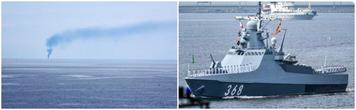 Het Russische korvet Vasily Bykow is mogelijk door een Oekraïense MLRS-raketwerper beschadigd, al kan dit niet verifieerd worden omdat er alleen een rookpluim op zee te zien was. (Foto: Twitter)