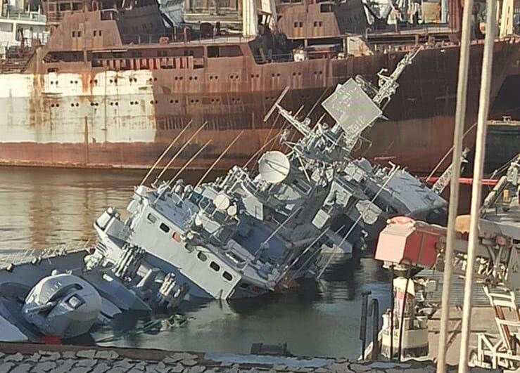 Op Twitter verscheen deze foto van het Oekraïense fregat Hetman Sahaydachniy, door de eigen bemanning tot zinken gebracht in de haven. (Foto: Twitter)