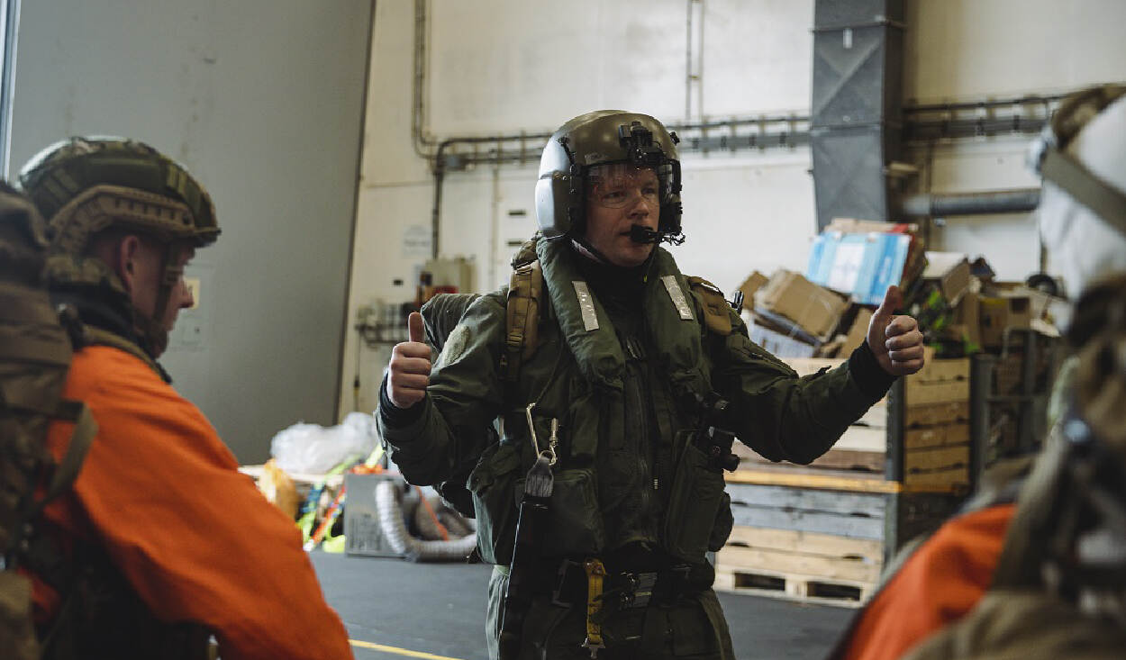 In de hangar van de Rotterdam legt doorgunner korporaal Jeffrey aan zijn Amerikaanse ‘gasten’ uit hoe ze veilig aan boord van de Cougar van 300 Squadron kunnen komen.