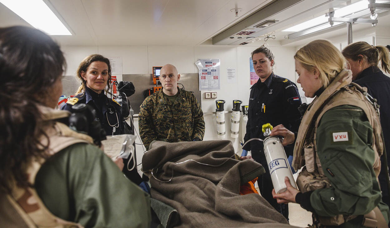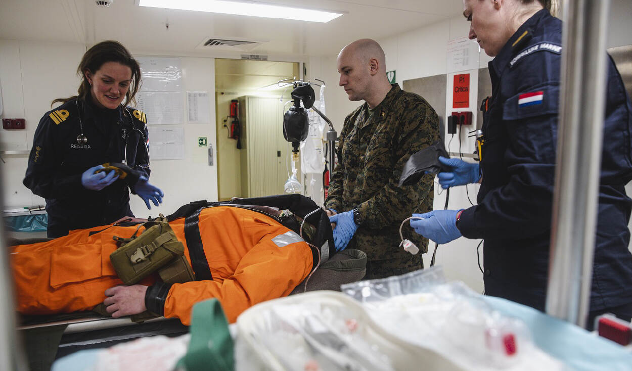 De denkbeeldige patiënt wordt verzorgd in de ziekenboeg van Zr.Ms. Rotterdam. Luitenant-ter-zee 1 arts Elza en haar Amerikaanse collega lieutenant Severiano samen in de weer. Die komt er vast snel weer bovenop.