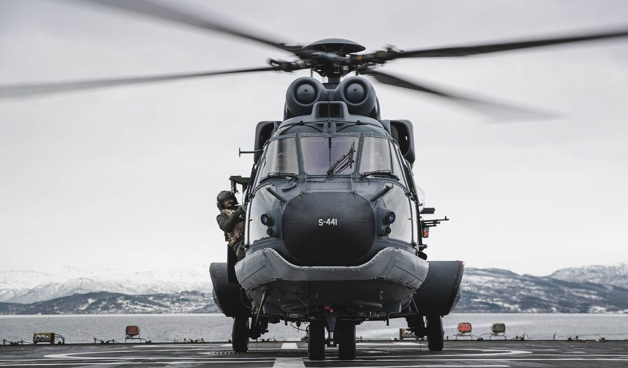 Frontaanzicht van de Cougar. Normaal thuis in Gilze-Rijen, nu opereren vanaf het amfibisch transportschip in bijna arctische omstandigheden.