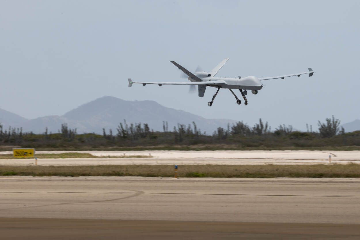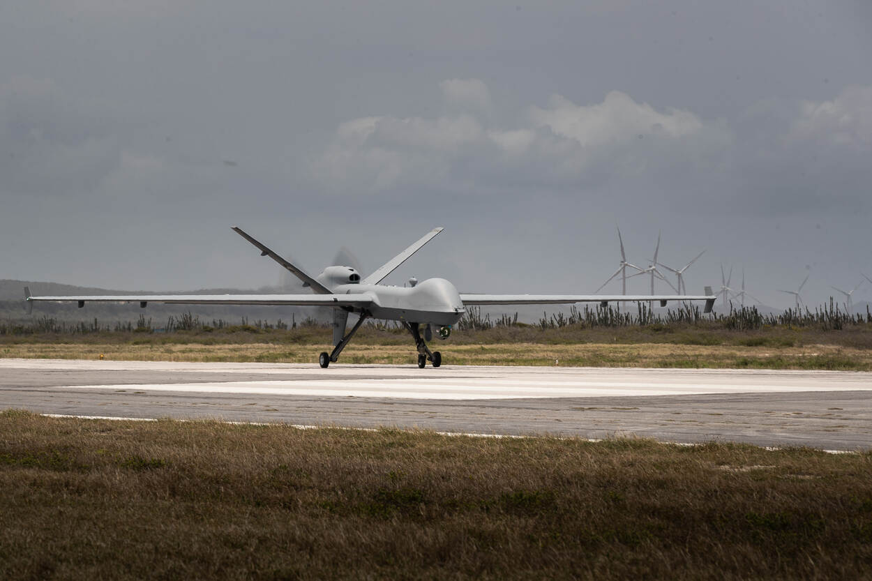Vanuit de cockpit op de grond stuurt vlieger ‘Hook’ afgelopen woensdag voor het eerst het onbemande verkenningsvliegtuig MQ-9 Reaper de lucht in. Het elf meter lange vliegtuig maakt daarmee officieel zijn entree binnen de luchtmacht. Vanaf Curaçao, want daar zijn de weersomstandigheden en de beschikbaarheid van het luchtruim opperbest om het toestel de komende tijd te beproeven.