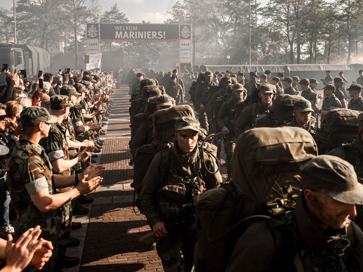 Sergeant Jasper Verolme was erbij toen onlangs weer een kersverse lichting mariniers (blok 21-3) binnenmarcheerde op de Rotterdamse Van Gent kazerne. De traditie van de afsluitende oefening, de Finex (final exercise), van hun opleiding. Na een week flink afzien moeten de mariniers, dan nog in spé, op die laatste dag nog 25 kilometer lopen met volle bepakking. Marinier word je niet zo maar, vandaar dat ze met groot applaus worden ontvangen.