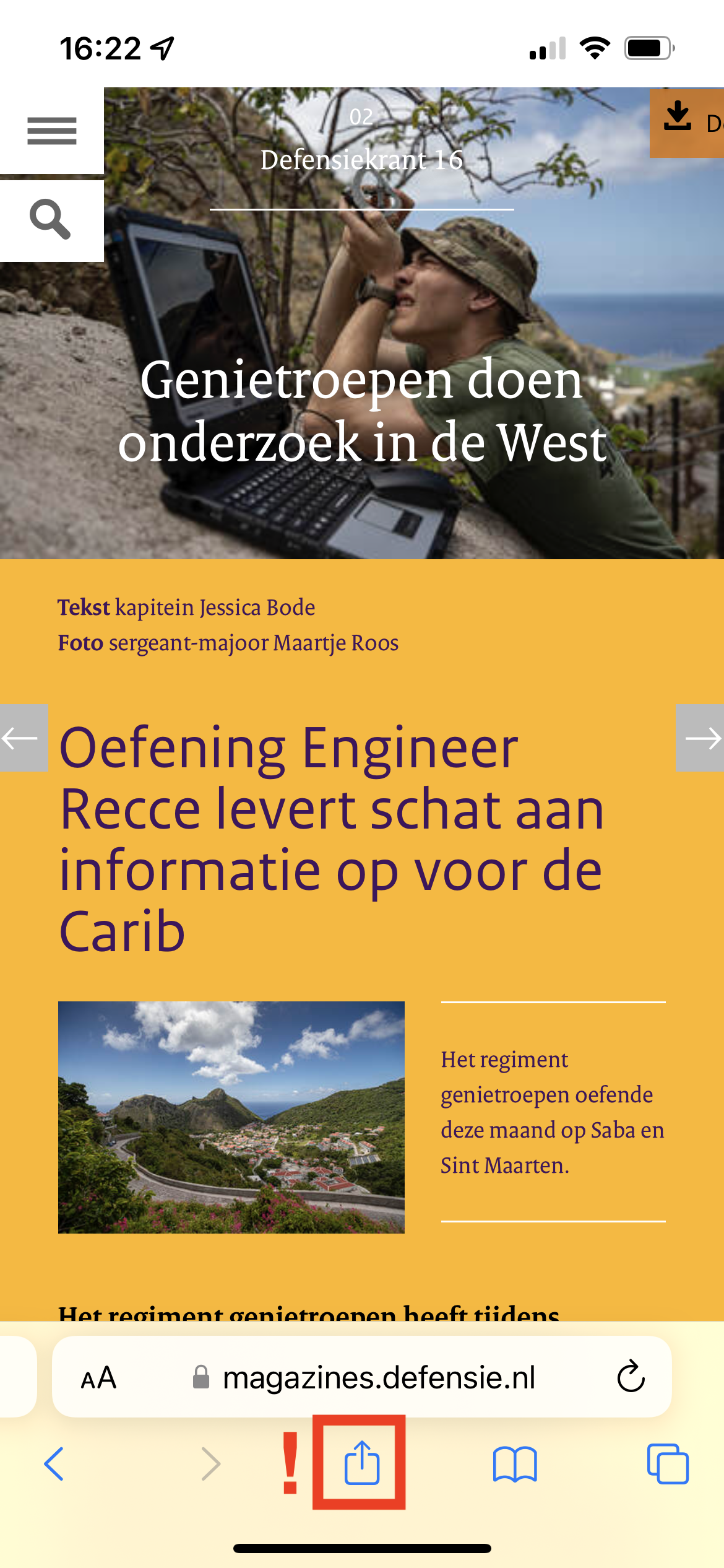 Open via Safari het verhaal uit de Defensiekrant waarvan u een kopie wilt maken. Druk daarna onderin het scherm op het vierkantje met het pijltje omhoog.