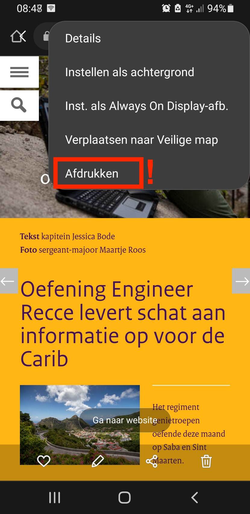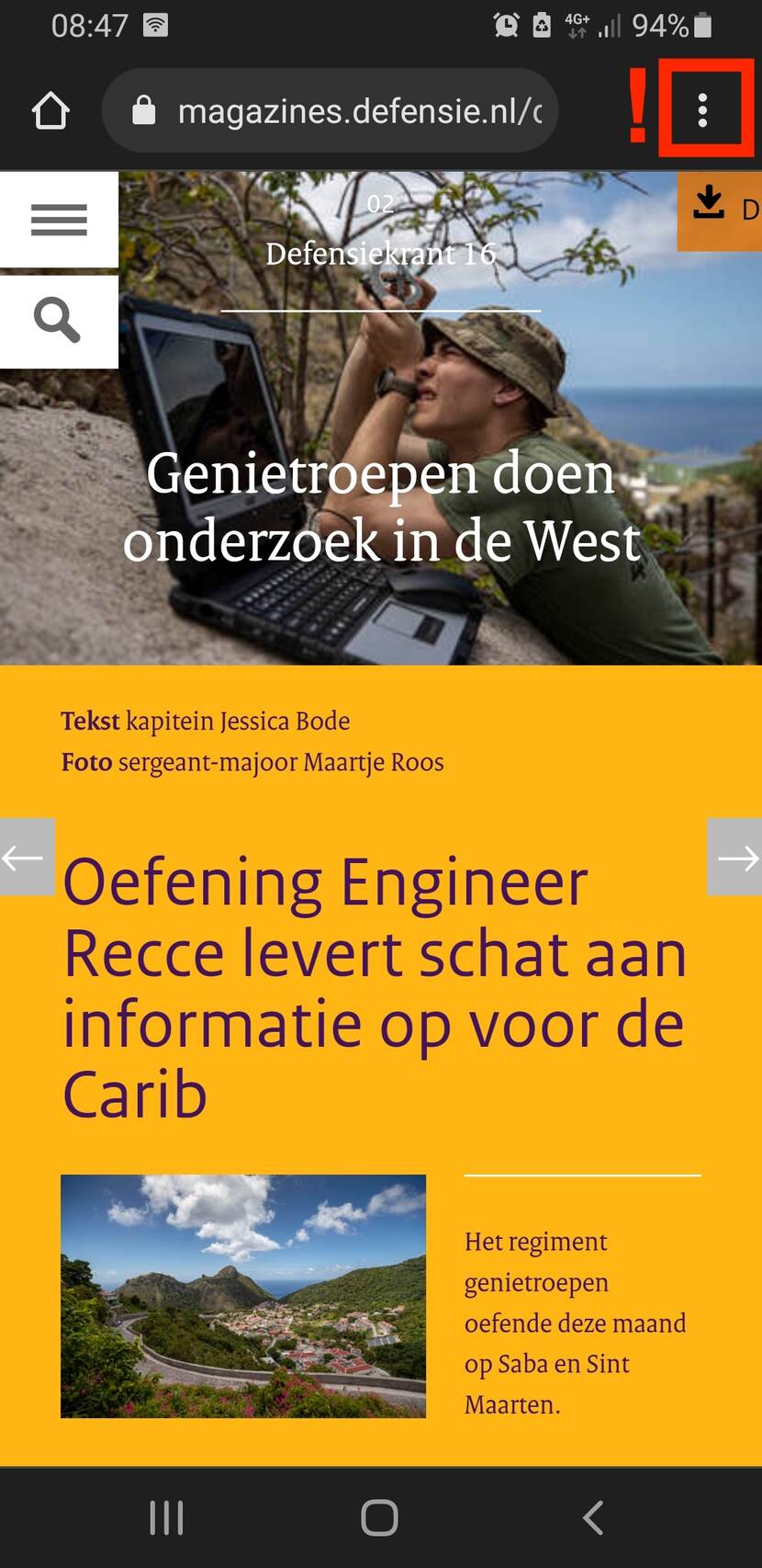 Open op uw smartphone via Chrome het verhaal uit de Defensiekrant waarvan u een kopie wilt maken en ga naar ‘menu’.