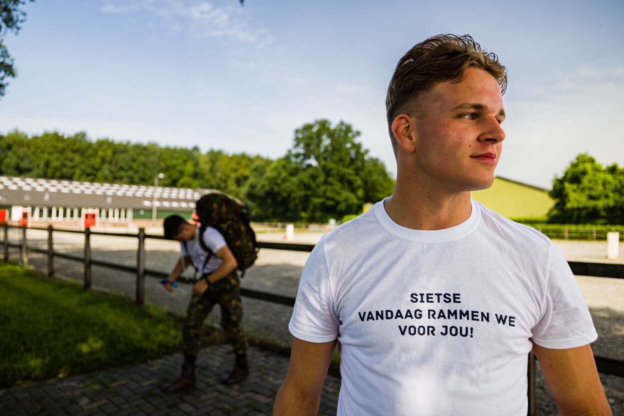 Een kleine groep in een wit T-shirt valt op in het verder groene gezelschap. ‘Sietse, vandaag rammen we voor jou!’ luidt de boodschap. “Eén van onze jongens is ernstig ziek, hij had hier wat graag bij willen zijn. Met deze actie steken we hem een hart onder de riem”, legt groepscommandant wachtmeester der eerste klasse Danny uit. Zijn leerlingen lopen stage bij 13 Infanteriebataljon Luchtmobiel en in Doorn bij het Korps Mariniers. “Een goeie groep”, constateert hij.