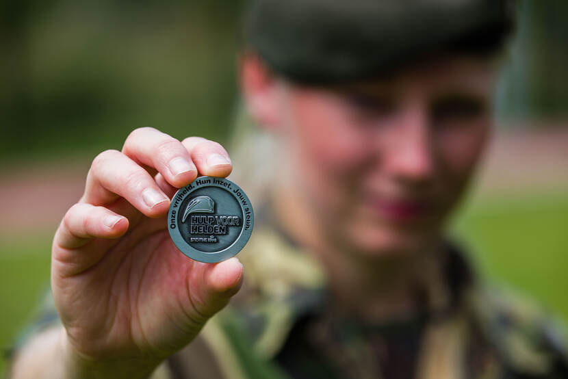 Het is daarna nog twee kilometer lopen terug naar school. Daar reikt voorzitter Van den Berg witte anjers (het symbool voor Veteranendag) en de eerste coins (munten) uit van de Stichting Hulp voor Helden aan Thomas (de oudste) en Leander (de jongste deelnemer) . Als bewijs dat ze de mars goed hebben afgelegd.