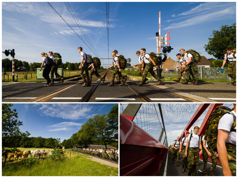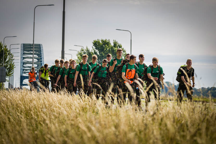 “Het is goed te doen”, zegt Thijs (“Ik wil bij de Koninklijke Marechaussee”) bij de eerste rustplaats, zo’n acht kilometer onderweg. Zijn ‘maten’ Fabian (“...naar het Korps Mariniers”) en Merlijn (“...zeker naar de Pantsergenie”) rusten wat in de schaduw. “Er is een lekker briesje, dat maakt het plezieriger”, zegt hij.