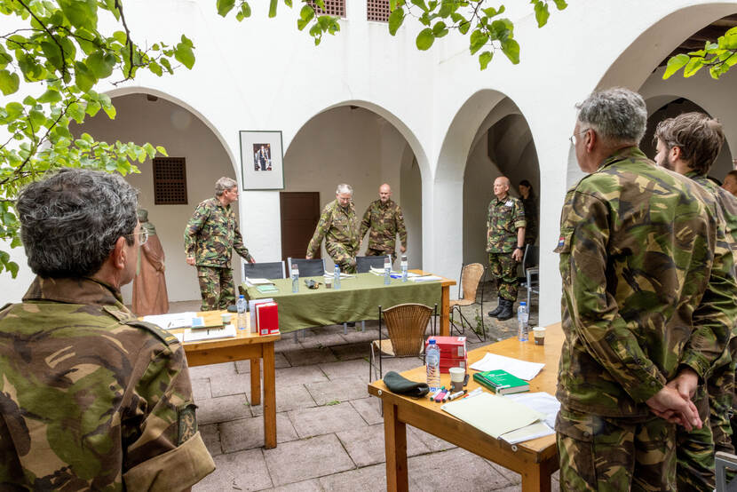Met het scherpe geluid van schuivende stoelen op de achtergrond gaat het publiek staan. De militaire rechtbank komt binnen: échte militair rechters stappen de binnenplaats op. Klaar staan de Officier van Justitie en de geacteerde verdachte met z’n raadsman. Iedereen, op de verdachte na, is reservist. Ze betreden geen statig gerechtsgebouw in een van de grote steden, maar staan ergens in de heuvels van Heilig Landstichting. De plaats waar oud-premier Dries van Agt jarenlang woonde.