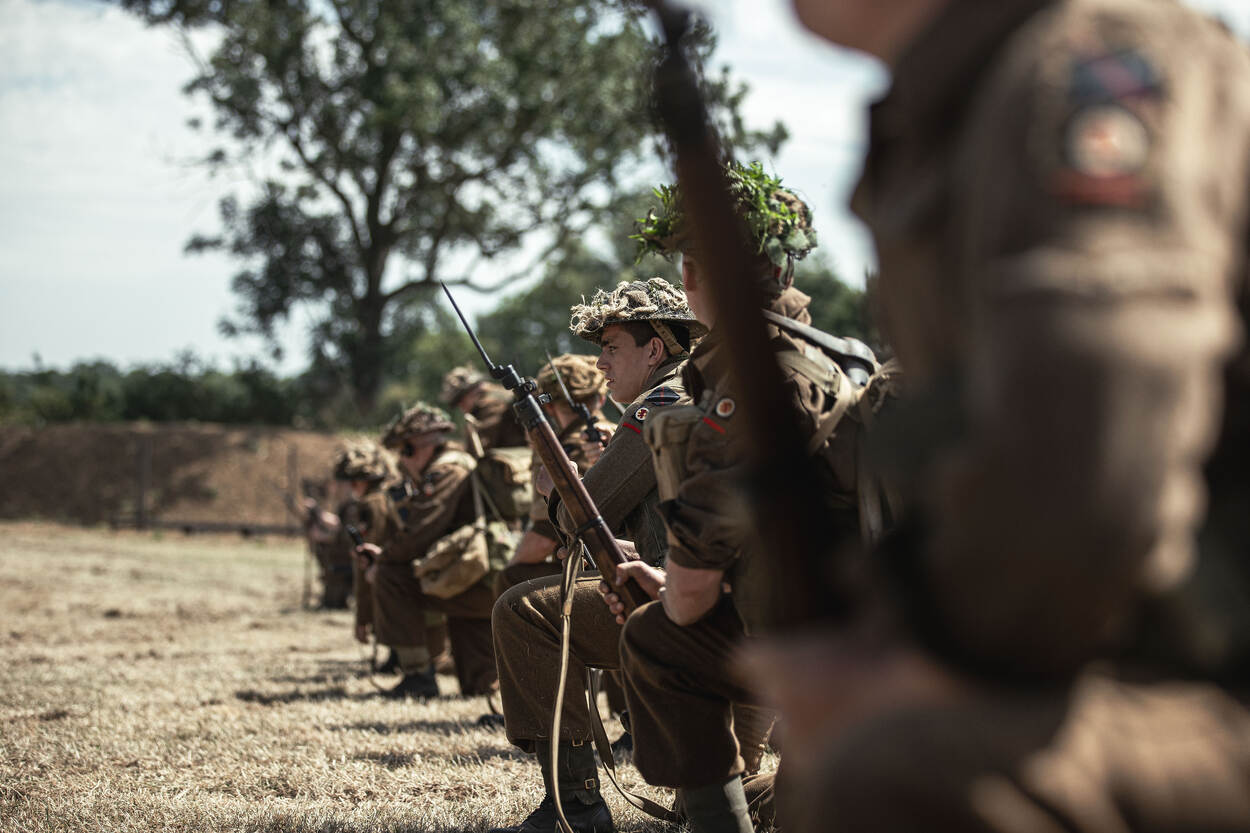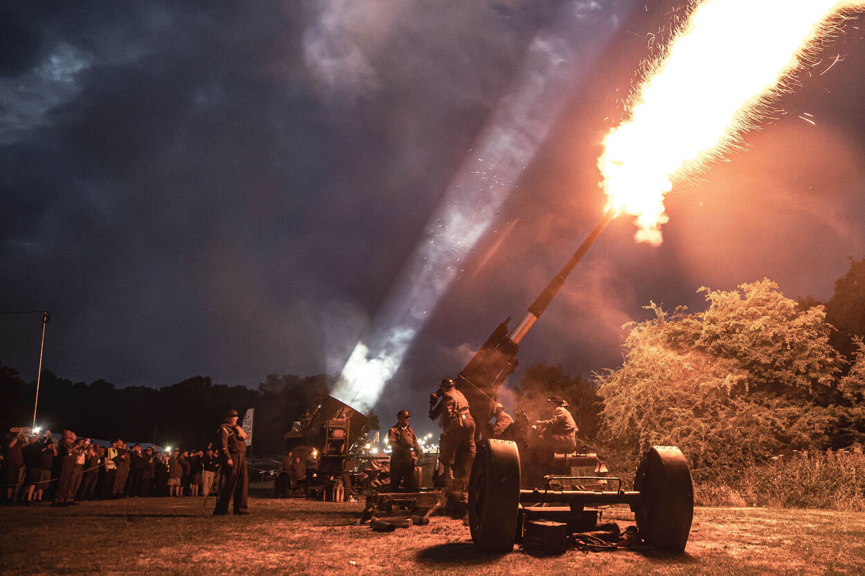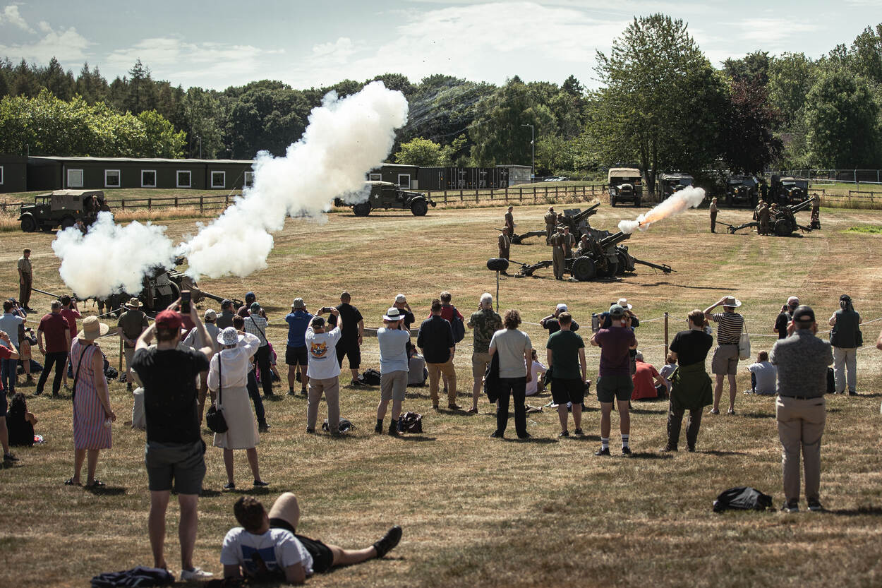 De levende geschiedenisgroep demonstreert iets later op de dag zijn kunsten. Een volledige artilleriebatterij van 25-ponders met bijbehorende trekkers stelt zich op voor een groot publiek en vuurt een aantal salvo’s af, precies zoals Britse artilleristen dat tachtig jaar geleden deden.
