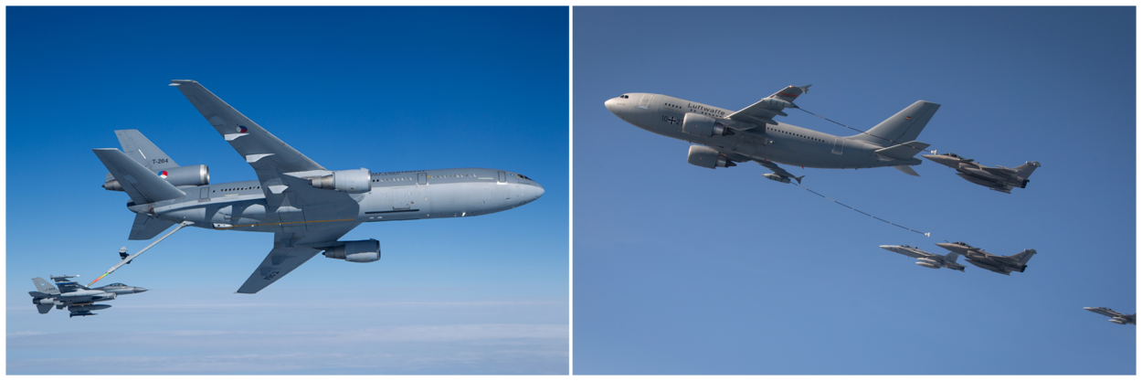 Ditzelfde kunstje wordt gedaan door twee Duitse Eurofighters. Zij tanken niet middels de boom, maar via hose and drogue onder de vleugel. Een techniek die misschien wel het beste te vergelijken is met een bij die op een bloem afvliegt en z’n tong in de nectar hangt en opzuigt.