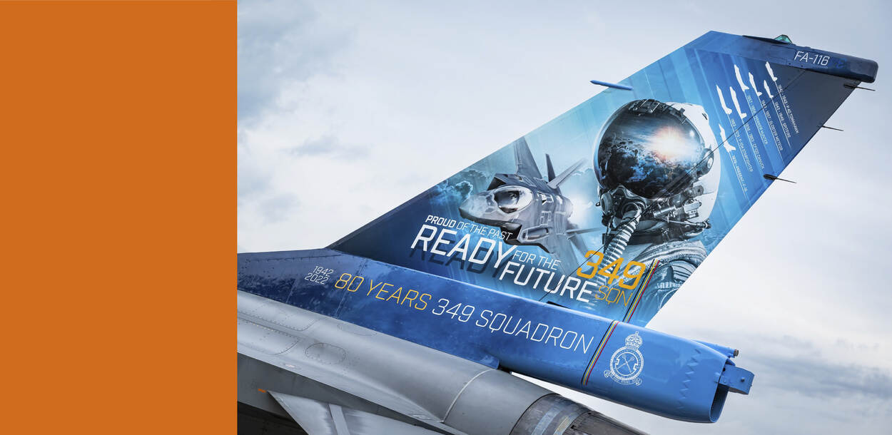 'Trots op het verleden, klaar voor de toekomst'. Dit thema, fraai uitgebeeld in een unieke staartbeschildering op een F-16 van de vliegbasis in Kleine-Brogel, onderstreept de tachtigjarige verjaardag van het 349e Squadron van de Belgische Luchtmacht.