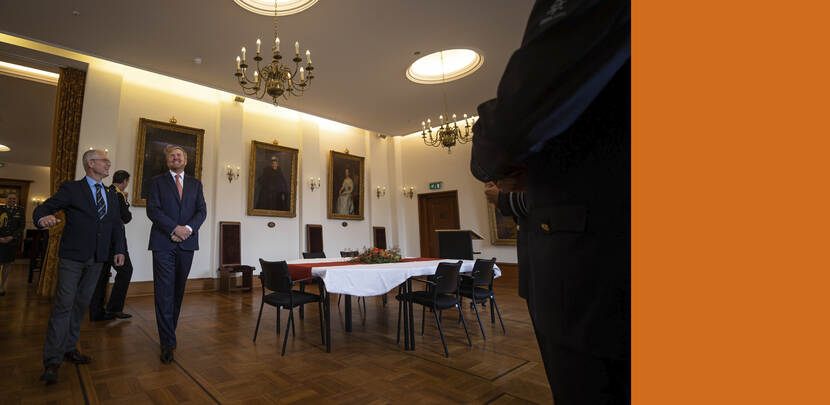 De koning, die zelf een opleiding bij de marine doorliep, zag vervolgens wat er in de afgelopen drie jaar allemaal is verbouwd op de zolder, eerste en tweede verdieping. Zo zijn tal van ornamenten en trappen gerenoveerd, tussenwandjes gesloopt en glas vernieuwd.