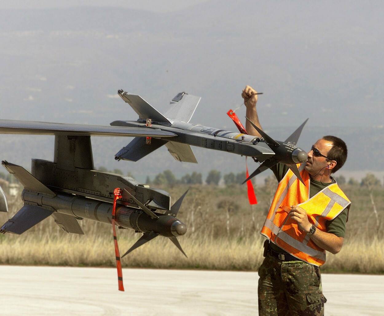 Vlak voor de start worden door bewapeningspersoneel de 'pennen' getrokken bij de lucht-lucht raketten. Die kunnen nu worden afgevuurd.