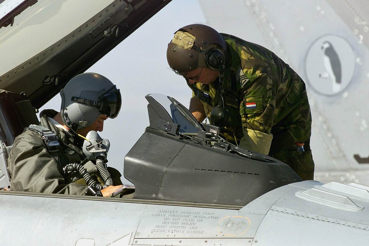 Vlieger en crewchief druk voor vertrek. Samen met andere collega's van het Nederlands-Belgische detachement in Amendola zorgden zij voor het succes dat de J-063 het beroemdste vliegtuig van de luchtmacht maakte.