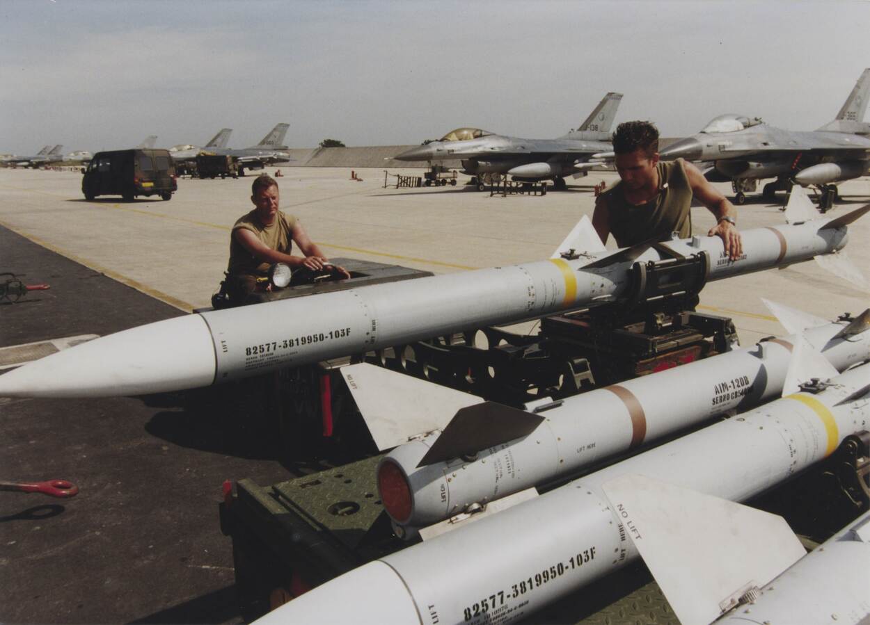 Bewapeningspersoneel in de weer met AIM-120 AMRAAM raketten. Met zo'n raket haalde Tankink de MiG-29 neer.