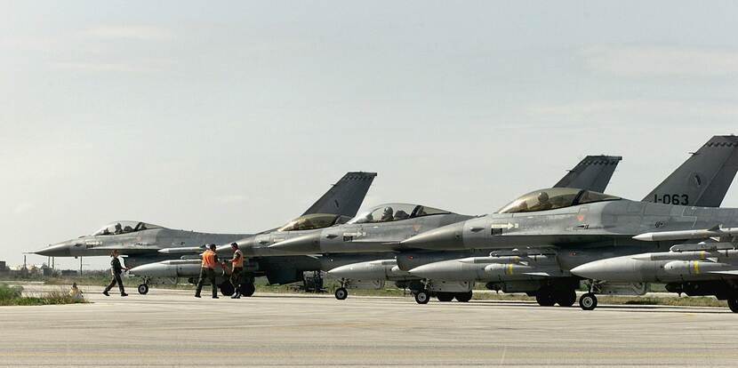 Vier F-16's, waaronder de J-063 die hier al is voorzien van de MiG-kill, staan klaar voor de start van een andere missie vanaf Amendola.