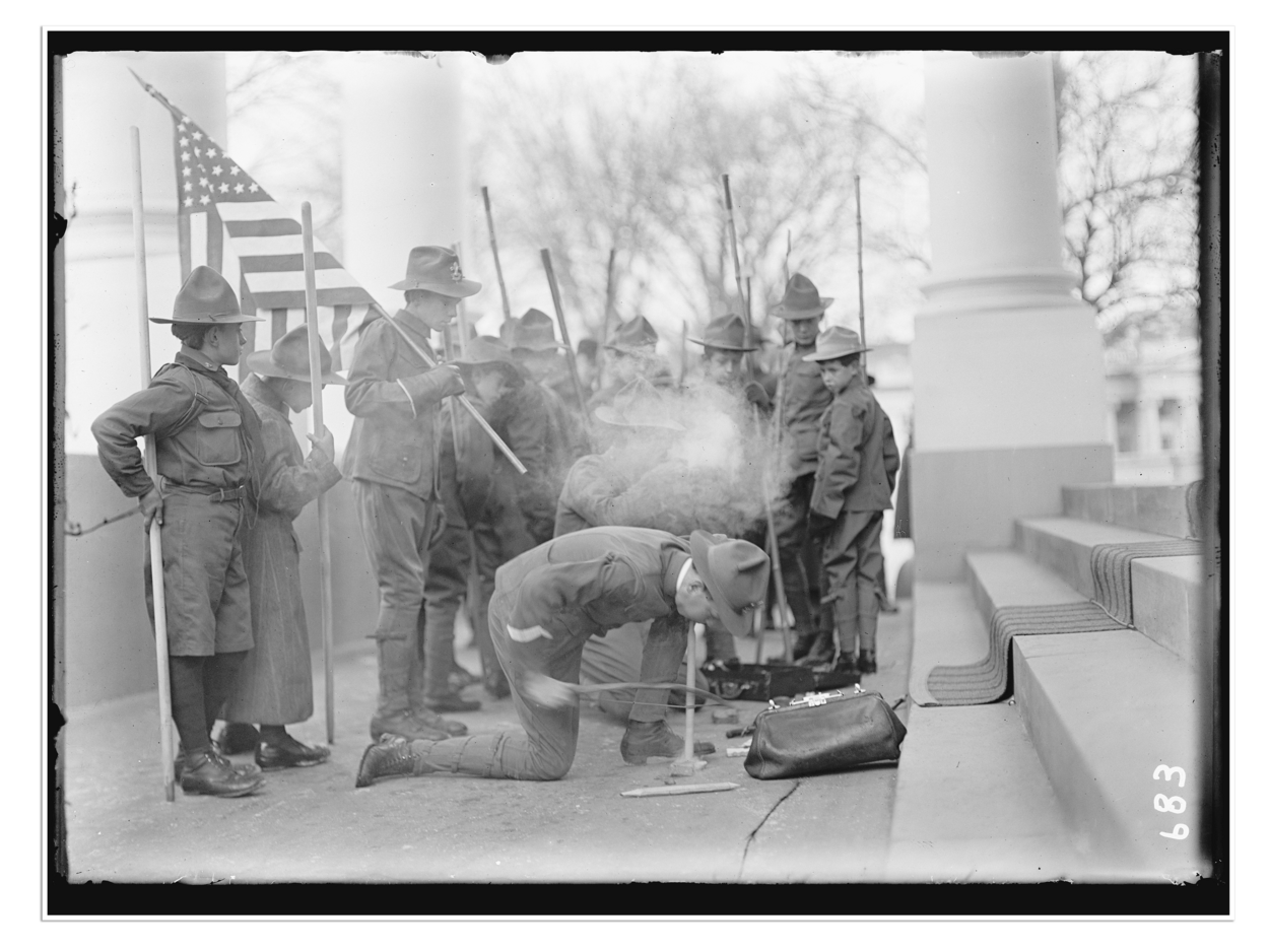 Bezoek van sir Robert Baden-Powell aan scouts in Washington die een demonstratie vuur maken geven (Harris & Ewing, Library of Congress).