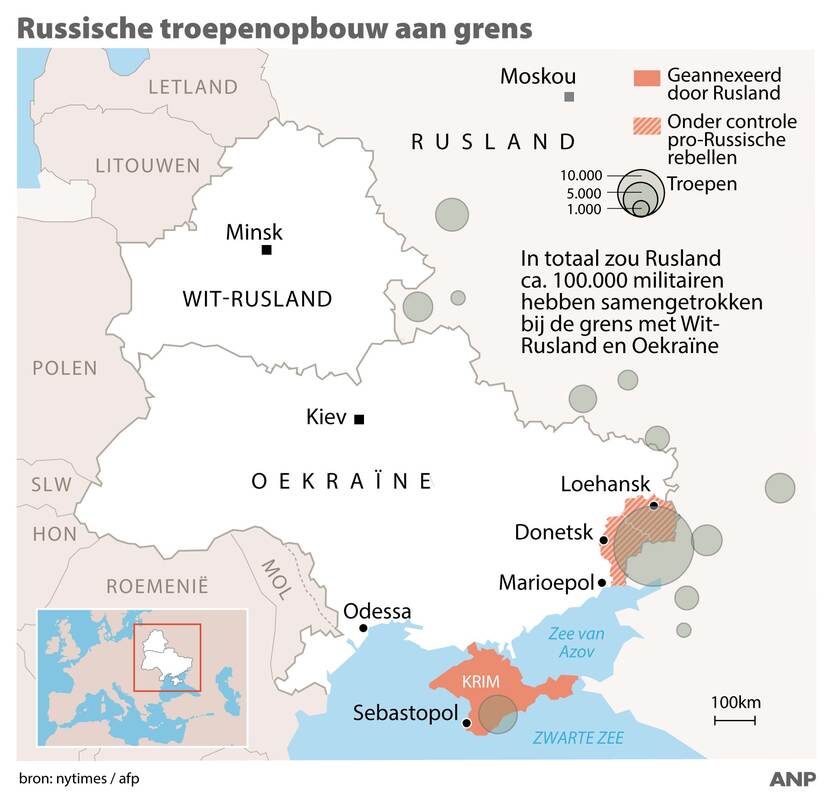 Een foto en infographic van de Russische troepenopbouw, voor de inval in Oekraïne.