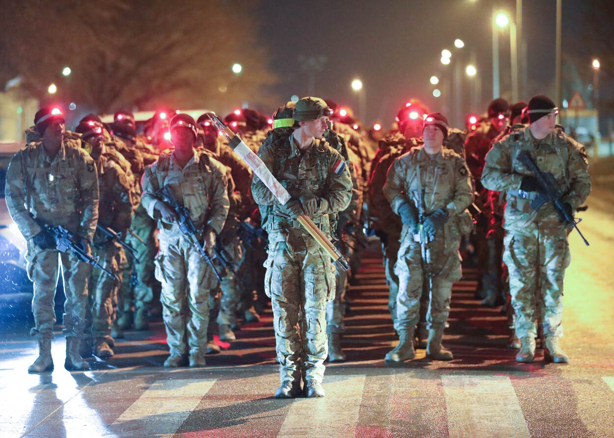 …Zo gaat 'ie beter. Alweer een kilometer! Marcheren met de blik op oneindig en stap voor stap. Nederlandse militairen samen met Roemeense, Franse, Amerikaanse en Slowaakse collega's tijdens de laatste loodjes van de zesmijls mars. Omgerekend circa tien kilometer. De foto is gemaakt tijdens de eerste multinationale Air Assault training op het Roemeense vliegveld Mihail Kogalniceanu. Foto: Robert Faison.