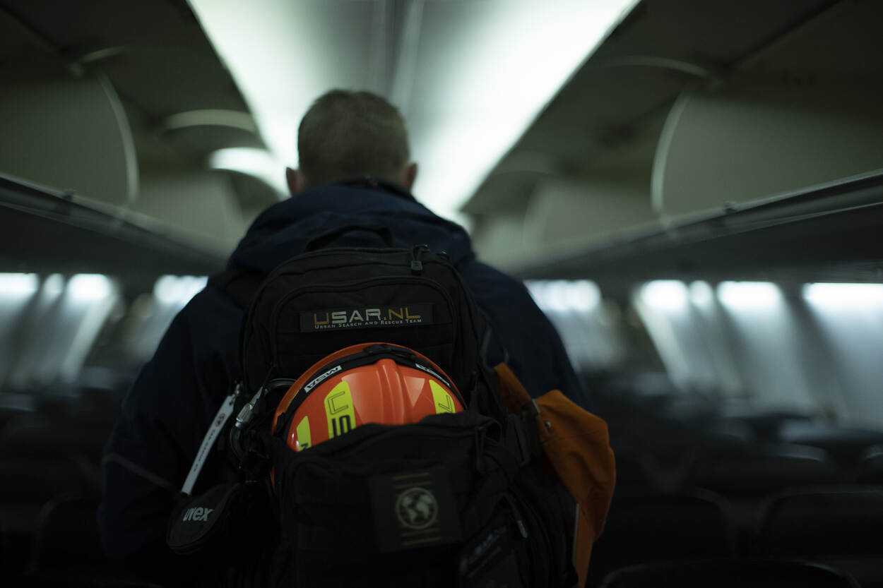 Tientallen pallets worden met grondankers vastgezet aan de laadvloer van de C-17. Tot de rand gevuld met vijftien ton aan onder meer betongereedschap, touwen en netten, brancards, microfoons, lakens en spaden. Ondertussen lopen acht overenthousiaste K-9 speurhonden met hun baas op het platform heen en weer. Zij en de tientallen andere specialisten van het Urban Search and Rescue Team, onder wie een aantal militairen, wachten in de terminal tot hun passagiersvliegtuig gereed is voor vertrek naar het door zware aardbevingen getroffen Turkije.