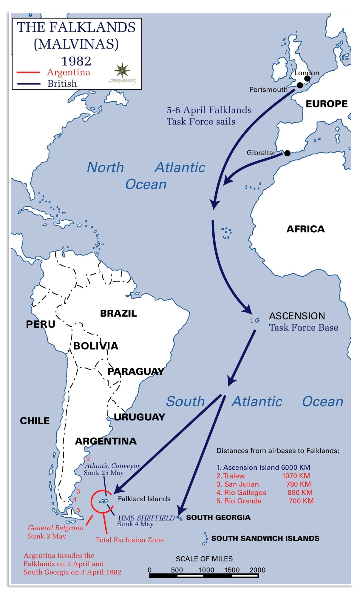 HMS Sheffield wordt twee dagen na het zinken van de Belgrano midscheeps getroffen door een Exocetraket, die vanaf 32 tot 45 km wordt afgevuurd door een Argentijns Super Étendard jachtvliegtuig. Na het zinken van de Sheffield trekken de grootste schepen van de Britse vloot (de vliegkampschepen HMS Invincible en Hermes) zich terug tot buiten het bereik van de Argentijnse vliegtuigen. Alleen de fregatten voor de beschieting van Argentijnse posities en troepentransportschepen zijn zo nog doelwit van de aanvallen door de Argentijnse luchtmacht.