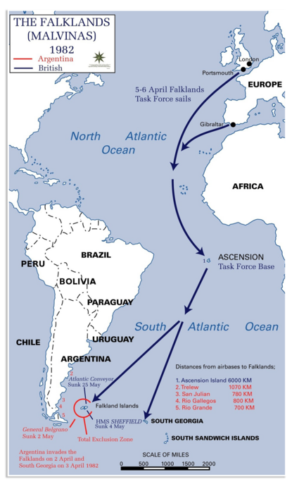 Anderhalve eeuw later, in 1982, gaat de Argentijnse junta (militaire dictatuur) van Leopoldo Galtieri over tot de bezetting van de Falklandeilanden. Vooral om de aandacht af te leiden van interne problemen, zoals de verslechterende economische situatie en onvrede over het bewind. De Argentijnse legerleiding gaat ervan uit dat het Verenigd Koninkrijk, dat ook grote economische en sociale problemen heeft, niet op de bezetting zal reageren. Dat blijkt een misvatting.